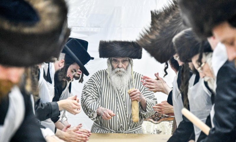 כשהוא לבוש ב'בעקיטשע' המיוחד, אפה האדמו"ר מקרעטשניף ירושלים מצות אחרי חצות בערב חג הפסח.