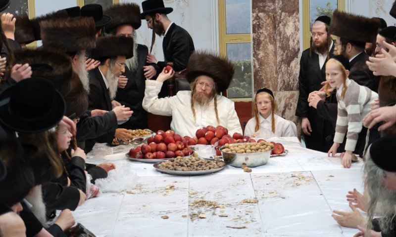 תמונות מימי הפסח בחצר שומרי אמונים. שיחה בחול המועד לבחורים, טיש נעילת החג אז זורק הרבי תפוחים ואגוזים לחסידים. צפו בגלריה