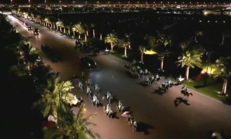 בתיעוד מרהיב במיוחד נראית שיירת הרכבים מלווה בעשרות פרשים שדהרו לפניה, חלק מטקס קבלת הפנים המלכותי. טראמפ התקבל בארמון לוסייל על ידי אמיר קטאר, שם השתתף בארוחת ערב חגיגית.