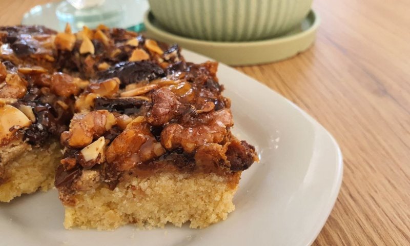 מתכון לעוגת חלבה, שוקולד ופיצוחים נדירה: בצק פריך ועשיר, מעליו שכבה נדיבה של חלבה מתוקה, שפע של פיצוחים קראנצ'יים ושוקולד מריר, כולם אפויים לשלמות ומצופים בסירופ מייפל. עוגה ממכרת וקלה להכנה