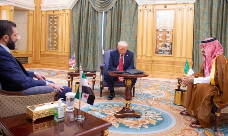 אך ה'ניו יורק טיימס' מדווח, על שינוי כיוון חד, ימים ספורים לאחר התקיפה האווירית של ישראל ב-2 במאי ליד הארמון בדמשק, הנשיא טראמפ נפגש עם נשיא סוריה אחמד א-שרע, דבר שלא עשה נשיא אמריקאי במשך כמה עשורים, והודיע על הסרת הסנקציות על המדינה. טראמפ אמר כי לא-שרע יש "סיכוי אמיתי להתאושש", לאחר מלחמת אזרחים בת כמעט 14 שנים שפירקה את סוריה.