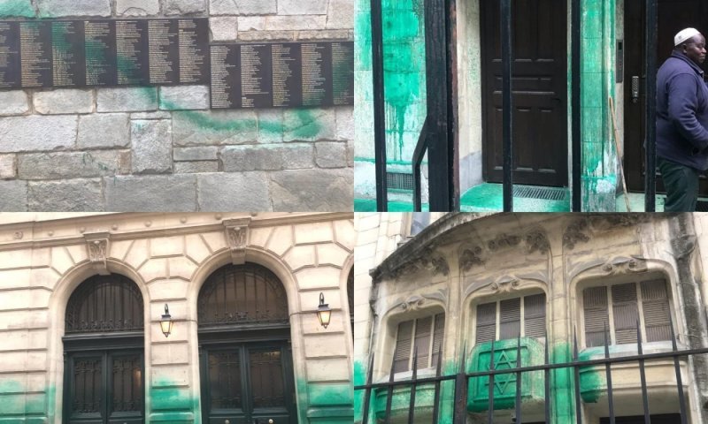 נזכיר כי בשבת מוסדות הקשורים לקהילה היהודית בפריז, הושחתו ברובע המארה במרכז פריז. אנדרטת שואה, בית הכנסת, מסעדה ובית הכנסת של אגודת הקהילות הושחתו בצבע ירוק.