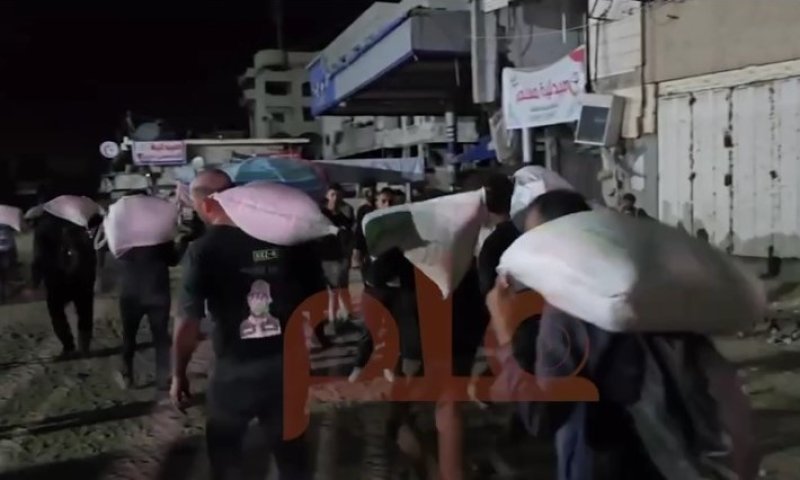 לפנות בוקר בציר החוף, באזור כיכר א-נאבלסי, ברצועת עזה. מאות אזרחים עזתים בזזו שקי קמח ממשאיות סיוע הומניטרי שהיו בדרכן לצפון הרצועה | תושבים רבים נצפו ברחובות כשהם נושאים שקי קמח על גבם ובידיהם, לאחר שלקחו אותם מהמשאיות • צפו