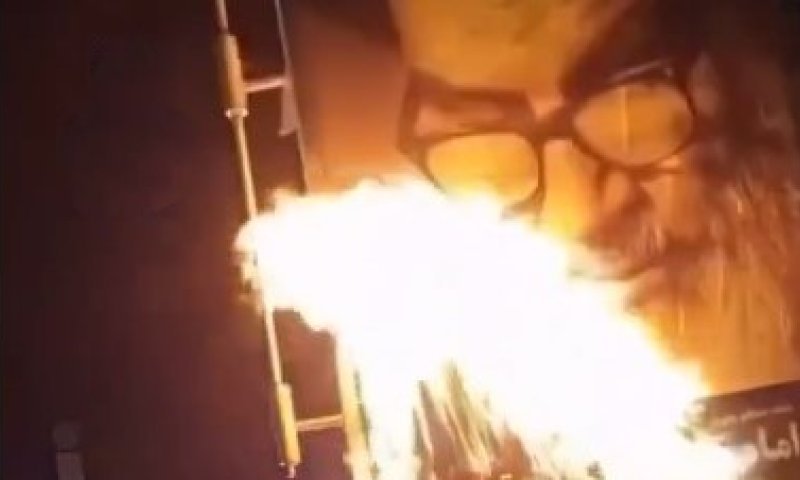 איראן: מתנגדי המשטר הציתו שלט ענק של חמינאי
