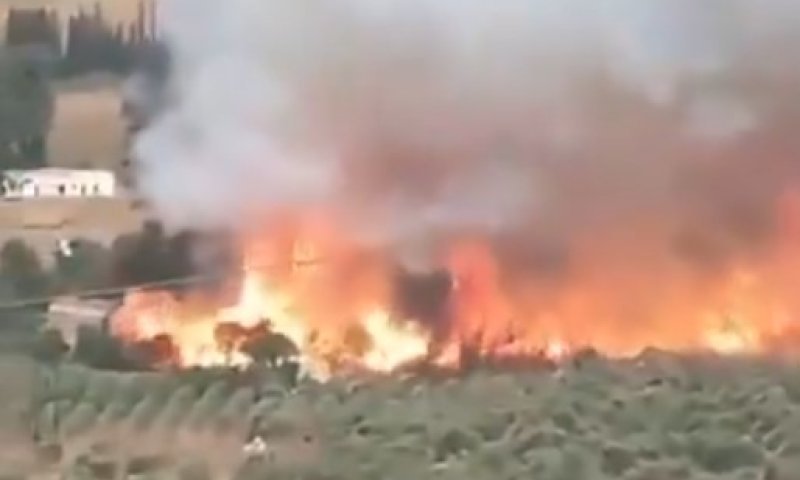 בתיעוד מפרברי ג'בלה שבצפון-מערב סוריה, נראה מחסן תחמושת הממוקם בבסיס א-סן עולה באש | בסרטון נראים פגזים ותחמושת עפים באוויר ממחסן הנשק שהתפוצץ