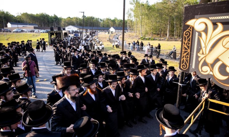 מעמד מרומם והיסטורי - חגיגת חנוכת הבית של קרית החינוך 'מחנה בני יחזקאל' דחסידי בעלזא בוואודריזש ניו יורק, המעמד נערך בשילוב מעמד הכנסת ספרי התורה ומעמד קביעת המזוזות בבתי המחנה.