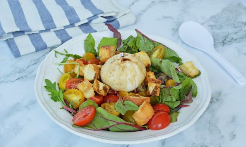 הכירו את הסלט שיהפוך כל אירוח חלבי לחגיגה קולינרית: גבינת בוראטה רכה ועשירה, העשויה ממוצרלה ושמנת, הנפתחת בחיתוך ומגלה מרקם נוזלי ומפתה. בשילוב עם קרוטוני באגט פריכים, עגבניות שרי מתוקות ועלי בייבי רעננים, הסלט הזה הוא פסגת הטעם האיטלקי