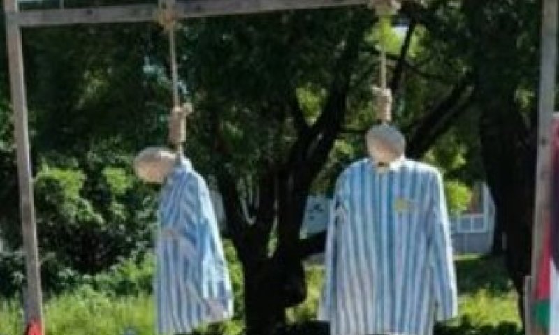 במהלך הפגנה פרו-פלסטינית בעיר אומאו שבצפון שוודיה, נראות שתי בובות תלויות על לולאה בנוסח הוצאה להורג.