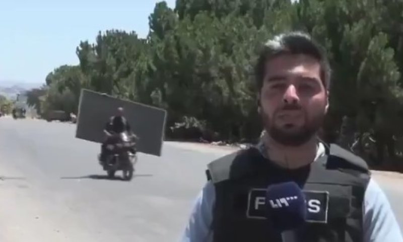 במהלך שידור חי של ערוץ הטלוויזיה הסורי הממלכתי SYRIA TV מהעיר א-סווידאא', נקלטה במצלמה תקרית המעידה על הכאוס השורר באזור. בעוד הכתב מדווח על העימותים, תועד מאחוריו אופנוען שבזז לוח סולארי מאחד הבתים בחסות העימותים