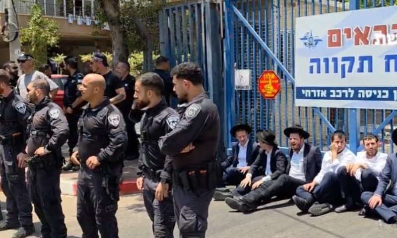 תקרית דרמטית במיוחד: צעיר חרדי שהגיע לתחנת המשטרה בפתח תקווה לקבלת תעודת יושר - זוהה כעריק מצה"ל ונעצר מיידית | כוחות המשטרה הצבאית הוזעקו למקום, והמפגינים מבקשים לשבש את העברתו לצבא | צפו בתיעודים