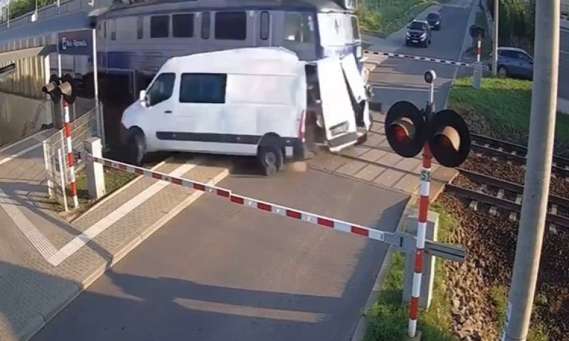 בוורשה, פולין, תיעדו מצלמות האבטחה התנגשות בין רכבת לטנדר | בתיעוד נראה נהג הטנדר נכנס למסילת הרכבת באור אדום, וכתוצאה מכך הרכבת שהגיעה לאחר שניות ספורות התנגשה בעוצמה בחלקו האחורי של הרכב. נהג הטנדר ניצל בנס