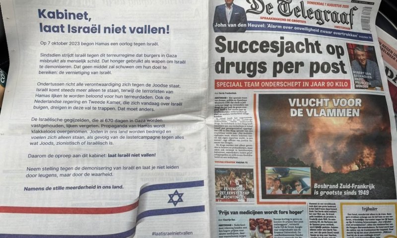ארגון יהודי בינלאומי פרו ישראל, פרסם מודעת תמיכה בעד ישראל בעיתון הולנדי פופולרי, לאחר שהולנד הפכה לעוינת מאד. הארגון ציין כי "כל הזעם מופנה נגד המדינה היהודית. ישראל נשארת יותר ויותר לבד, בעוד שהמחבלים מחמאס נראים כזוכים לפרס על מעשי הטרור שלהם"