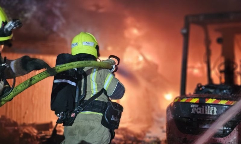 11 צוותי כיבוי פועלים בשריפה עזה שהחלה במחסן באזור התעשייה בשיכון ד' בטבריה והתפשטה למבנה נוסף • חלק מהגג קרס, המשטרה מפנה את האתר בשל עשן כבד