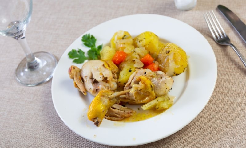 - מוסיפים פרוסות תפוחי אדמה קלופות, חצאי גזר וכוס מים חמים.
