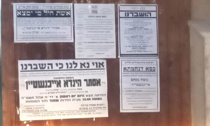 לאחר ארבע שנות מחלה קשה, הסתלקה לבית עולמה אשת החסד מרת אסתר הינדא אייכנשטיין ע"ה, שהותירה אחריה בית מלא יתומים וחובות כבדים • בעלה, תלמיד חכם ומרביץ תורה, לא יודע איך להתמודד עם העול הכלכלי הקשה. תורמים עכשיו למען עתיד היתומים