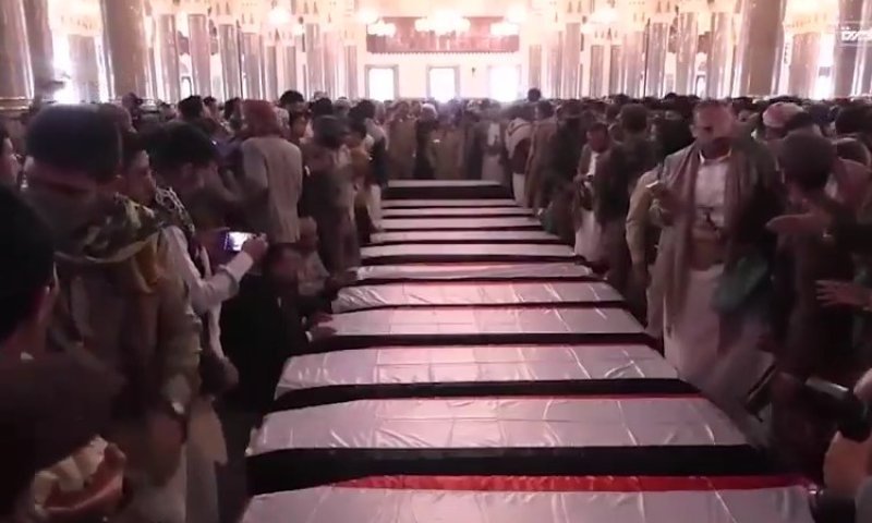בתיעוד שפורסם ברשתות החברתיות נראים ההמונים כשהם חולפים על ארונותיהם של ראש ממשלת החות'ים ושרי ממשלתו במסגד א-שעב ("העם") בבירת תימן