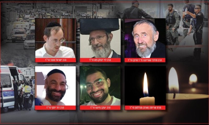 הרב לוי יצחק פש הי"ד בן 57, האברך הרב יעקב פינטו הי"ד בן 25, האברך הרב ישראל מצנר הי"ד בן 31, האברך הרב יוסף דוד הי"ד בן 43, הרב מרדכי שטיינצג הי"ד בן ה-79 ומרת שרה מנדלסון הי"ד בת 57. חלק מהלוויות יערכו עוד הערב