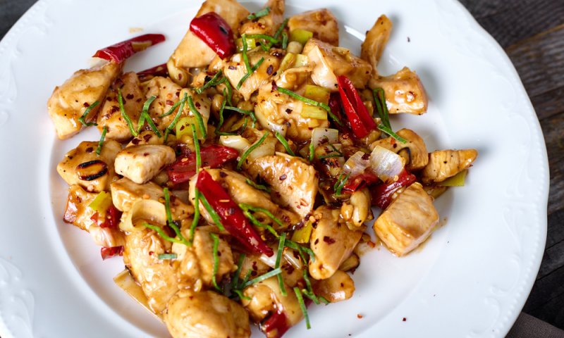 קוביות עוף על מצע פלפלים בזילוף יין ודבש
