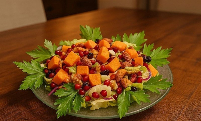 מתכון לסלט חסה עם קוביות בטטה פיצוחים וגרעיני רימון בתיבול מושלם