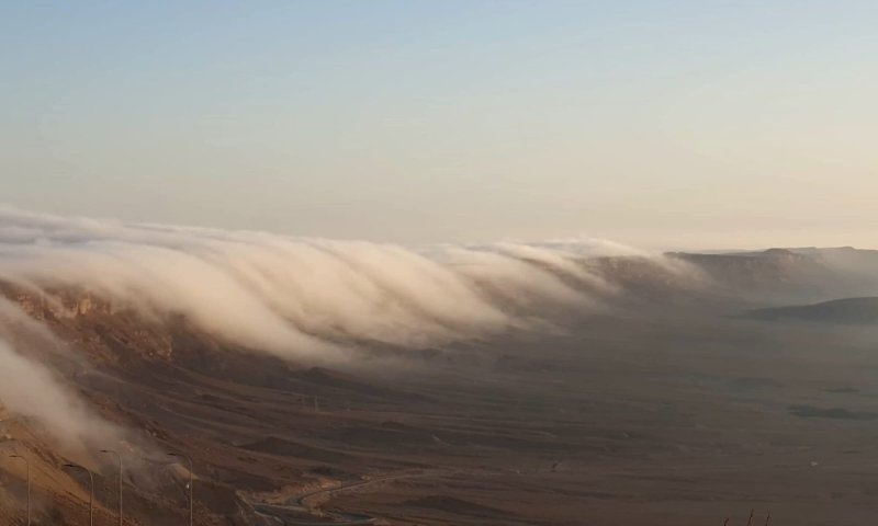 מחזה יוצא דופן נצפה הבוקר (שלישי) במכתש רמון שבנגב: "גלישת עננים" – אחת מתופעות הטבע המרשימות שמאפיינות את האזור המדברי – נצפתה במלוא עוצמתה.