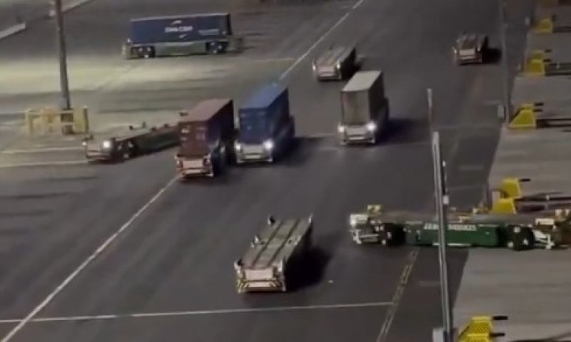 למרות המראה העתידני – מדובר בארה"ב, לא בסין: בנמל לונג ביץ' שבקליפורניה מופעל מערך מתקדם של למעלה מ-100 כלי רכב אוטונומיים המשנעים מכולות בין מנופי הרציף, אזורי האחסון ותחנות ההעמסה לרכבות | המכולות נעות על גבי רכבים ללא נהג, המגיעים למהירות של כ-21 קמ"ש ויכולים לשאת משקל של עד 70 טון
