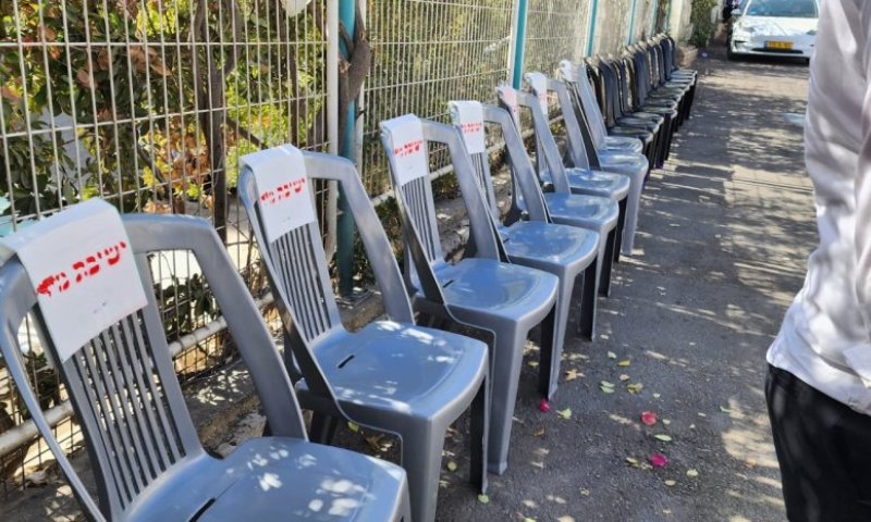 כעת מחוץ לישיבת יקירי ירושלים הכסאות שהוכנו לרבני ישיבת מיר בהפגנה