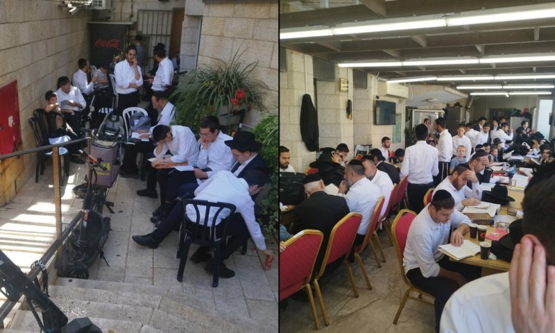 אברכים חרדים לצד כיפות סרוגות לומדים יחד בישיבת 'מרכז הרב' לפני ההפגנה