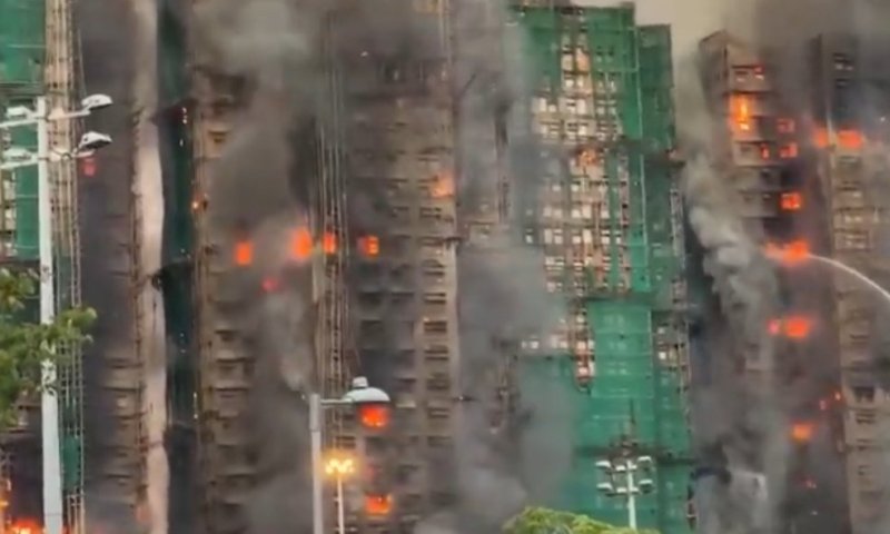 עמודי אש ועשן כבד נראו כשהשריפה התפשטה על פני פיגומי הבמבוק ורשתות הבנייה שעטפו את חזית המתחם ברובע טאי פו. על פי הרשומות, המתחם כולל שמונה בלוקים וכמעט 2,000 דירות.