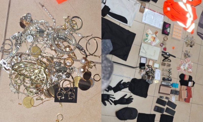 בחיפוש שבוצע אותר רכוש רב החשוד כגנוב, כסף במטבעות שונים וכן ציוד רב המשמש לכאורה לביצוע פריצות בדירות. בין הפריטים שנתפסו נמצאו כלי פריצה, ווסטים כתומים, כפפות עבודה, שלוש מסכות פנים, קופסת כדורים לנשק מסוג חמש חמש שש, שש שעונים, עשרות פריטי תכשיטים ומטבעות, ביגוד החשוד כגנוב וזוג פמוטים מוזהב בעל מראה ייחודי. כמו כן נתפסו סכומי כסף הכוללים אלף מאתיים חמישים אירו, מאה דולר ואלף שמונה מאות חמישים שקלים.