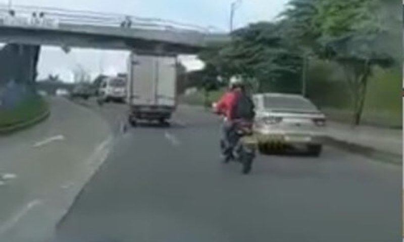 תיעוד מחו"ל שהופץ ברשת החברתית בו נראה אופנוען כשהוא עוקף משאית מצד ימין ומחליק תחת אוטובוס שנסע לפניו • צפו